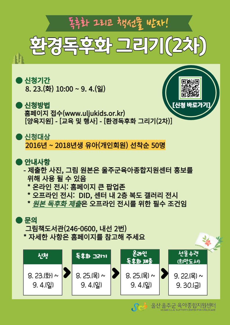 현재는 유아를 대상으로 [환경독후화 그리기(2차)]와 부모강연으로 이호선 교수님의 [가족을 움직이는 소통 심리학]을 신청받고 있는중입니다.
