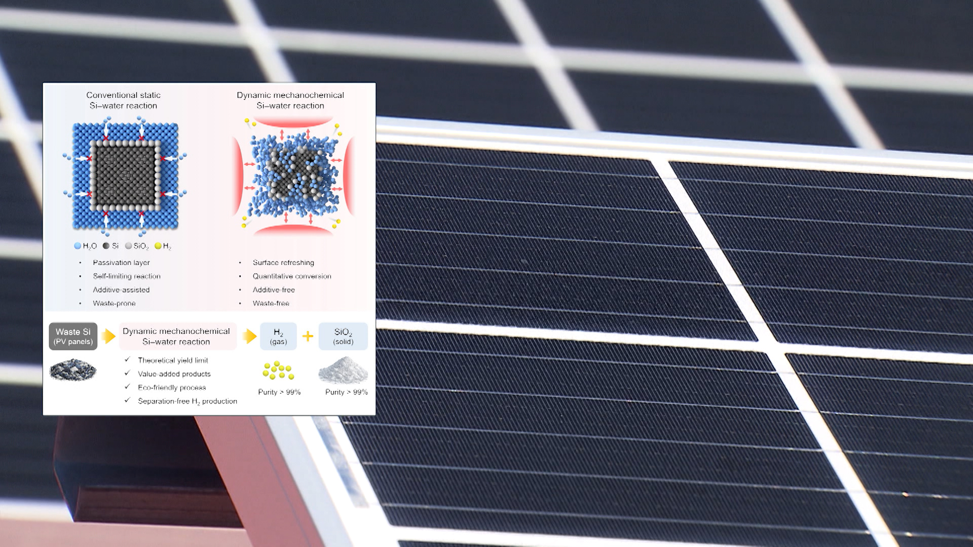 수명을 다한 1세대 태양광 발전 폐패널이 쏟아지고 있는 가운데 이를 활용해 수소와 화학소재를 동시에 만드는 기술이 개발됐습니다.UNIST 에너지화학공학과 백종범 교수팀은 폐태양광 패널의 실리콘을 물과 반응해 수소와 산업용 소재인 실리카를 생산하는 고효율 공법을 개발했다고 밝혔습니다.연구팀은 2차 환경 오염 우...