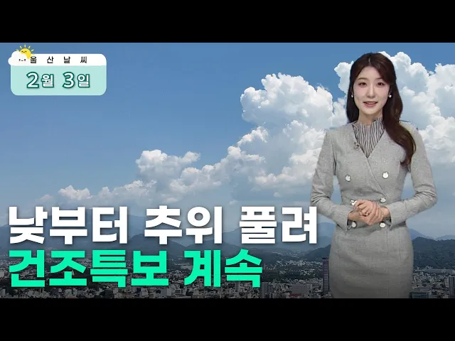 [울산, 낮 최고 10도.. 주말까지 포근]1) 낮 동안 포근한 날씨가 예상됩니다. 따뜻한 남서풍에 의해 한낮 최고기온 10도까지 오르겠는데요. 다만 현재 기온은 영하권인 만큼 입고 벗기 쉬운 겉옷 챙기시는 게 좋겠습니다.2) 주말에는 기온이 더 오르겠습니다. 아침 최저기온 영상권으로 시작해서 내일 한낮 기온 15도까지 ...
