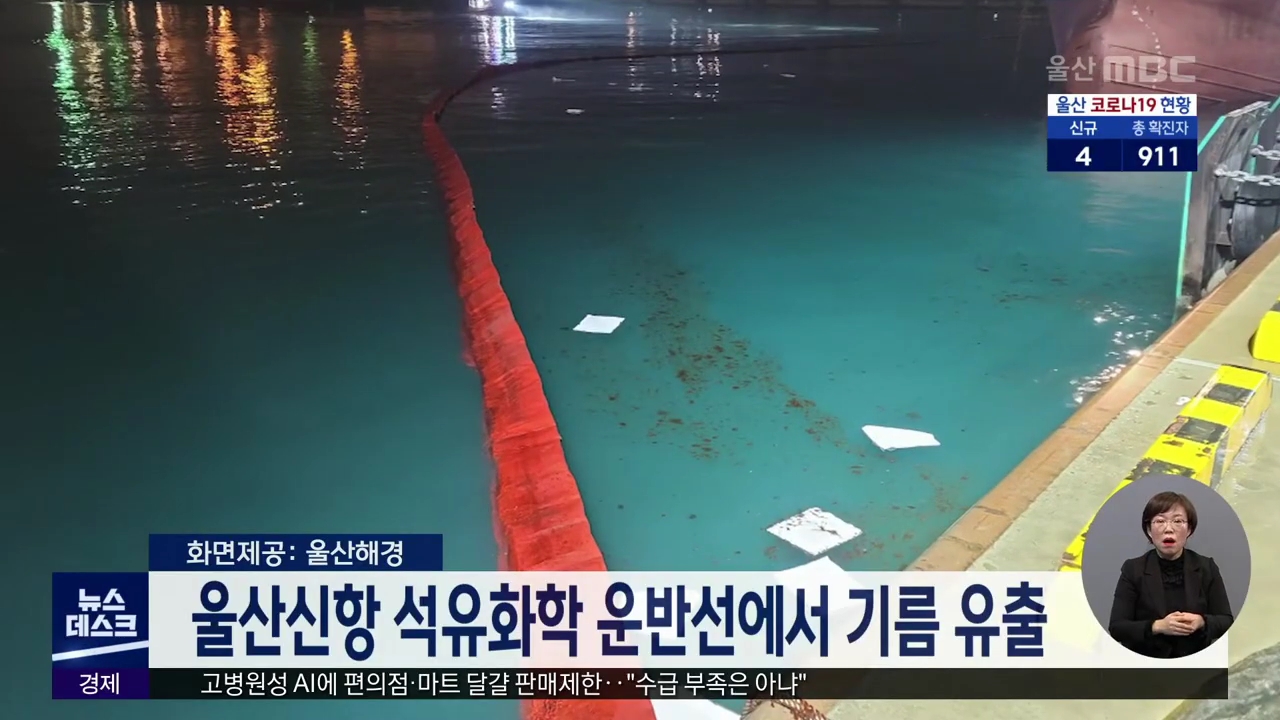 오늘(1/22) 새벽 1시 50분쯤 울산신항에서 화물이송 작업을 하던 부산선적 2천톤급 석유화학 운반선에서 기름이 유출됐습니다. 사고가 나자 해경은 오일펜스를 설치하고 긴급 방제 작업을 벌였습니다. 해경은 선박 균형 수 배출 과정에서 기름이 유출된 것으로 보고 사고 경위와 유출량을 조사하고 있습니다. //
