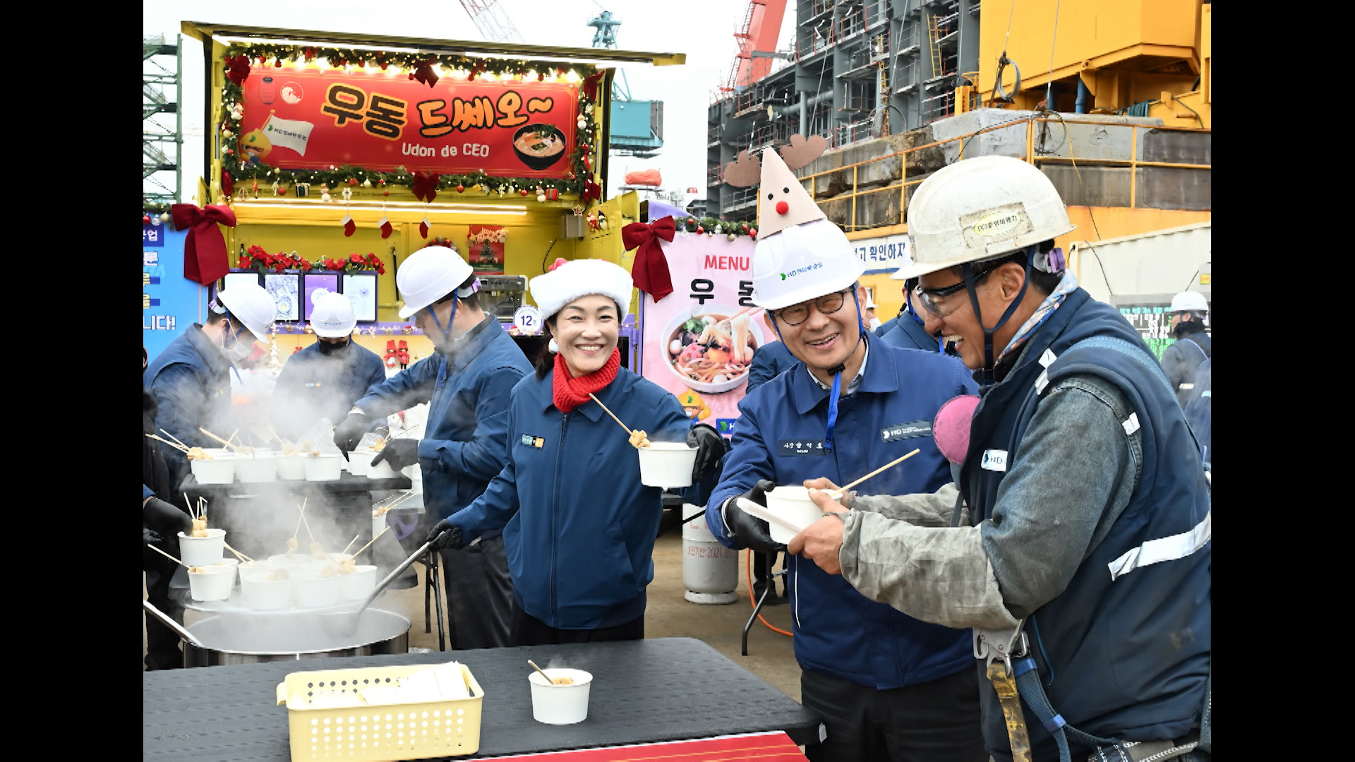 HD현대중공업이 추운 겨울철 생산 현장에서 일하는 직원들이 몸을 녹일 수 있도록 따뜻한 우동을 제공하기로 했습니다.H현대중공업은 내년 2월 중순까지 총 42차례에 걸쳐 현장 직원에게 우동을 제공하는 찾아가는 간식차를 운영한다고 밝혔습니다.간식차는 선박 건조 등 생산 현장 42개소를 돌며 회당 1천인분씩, 총 4만2...
