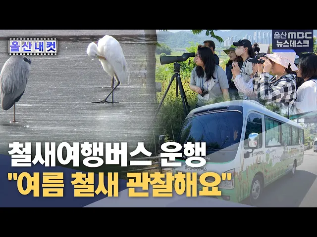 [앵 커] 울산 태화강에는 매년 수십만 마리의 철새가 찾아오는데요. 이 울산의 명물을 가까이에서 관찰할 수 있는 철새여행버스가 운행에 들어갔다고 합니다. 울산의 즐길 거리를 소개하는 울산내컷 여름 철새를 만나러 성예진 리포터가 다녀왔습니다. [리포트] 울산의 대표 철새인 떼까마귀 그림이 그려진 버스 한 대가 도...