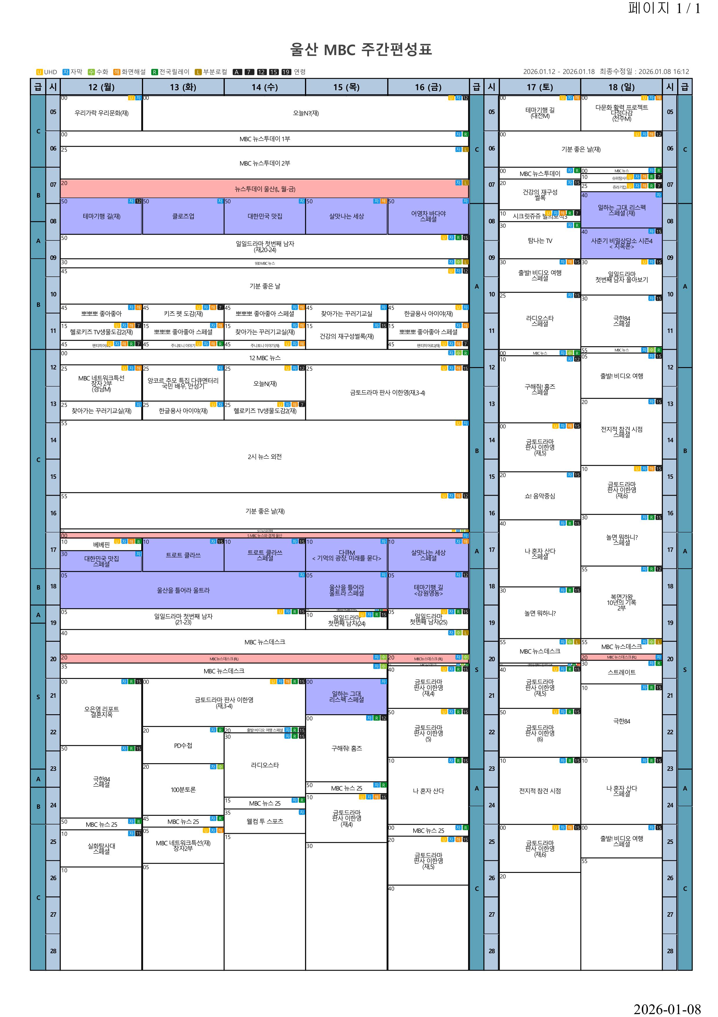울산MBC TV 2026년 1월 3주 주간편성표