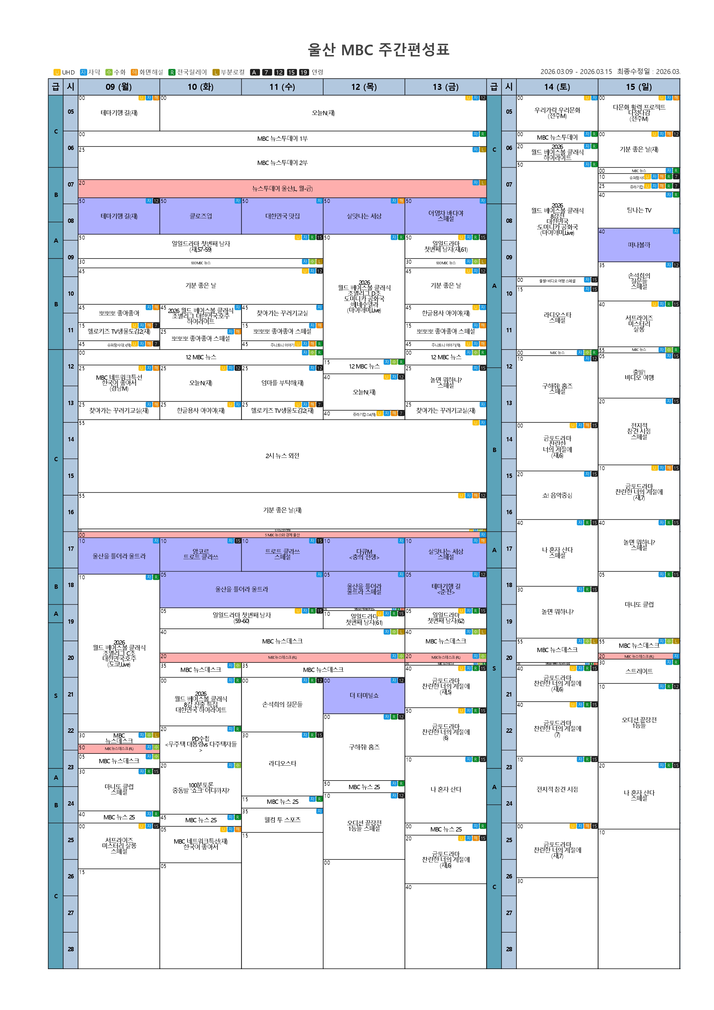 울산MBC TV 2026년 3월 2주차 주간편성표