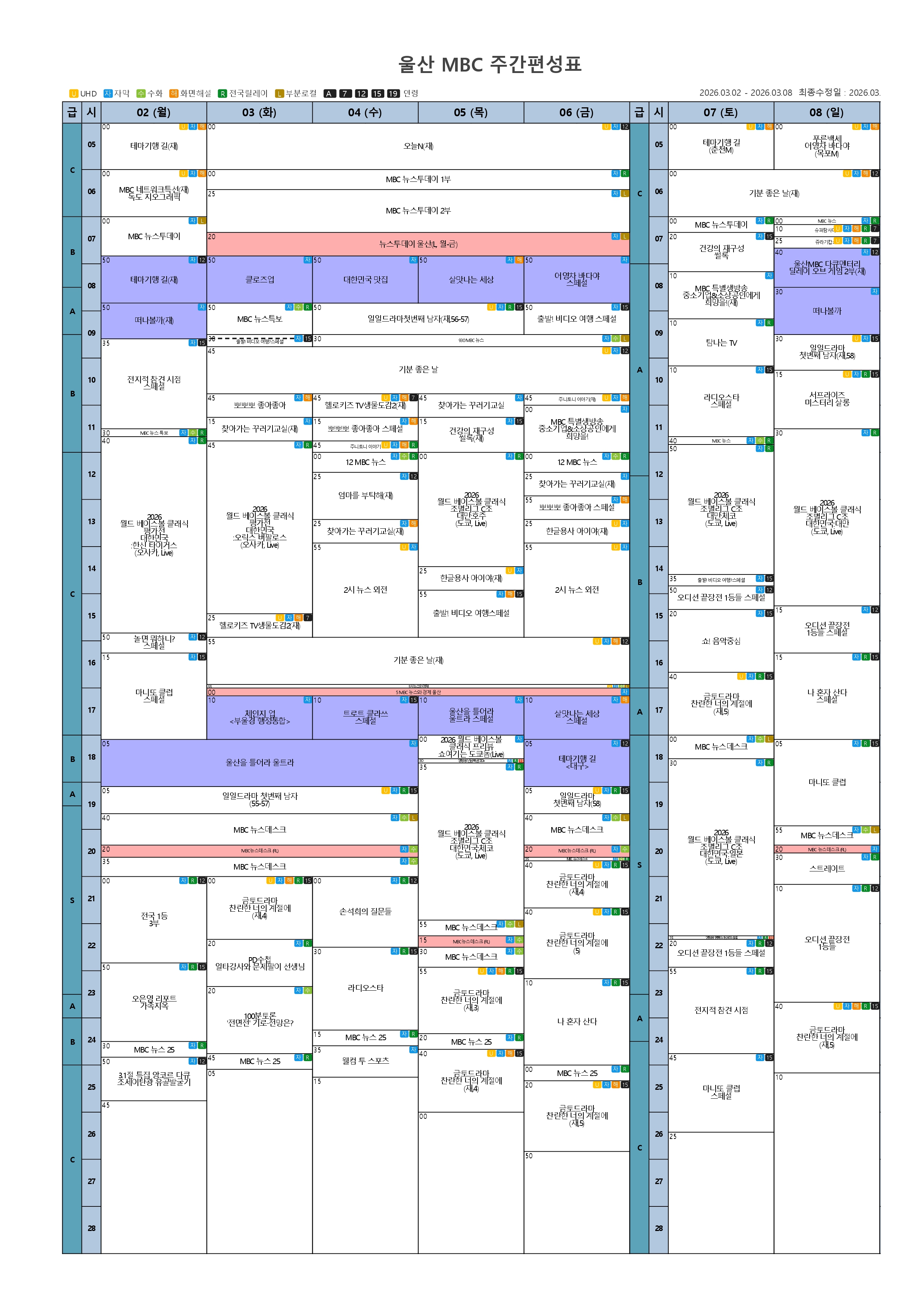 울산MBC TV 2026년 3월 1주차 주간편성표