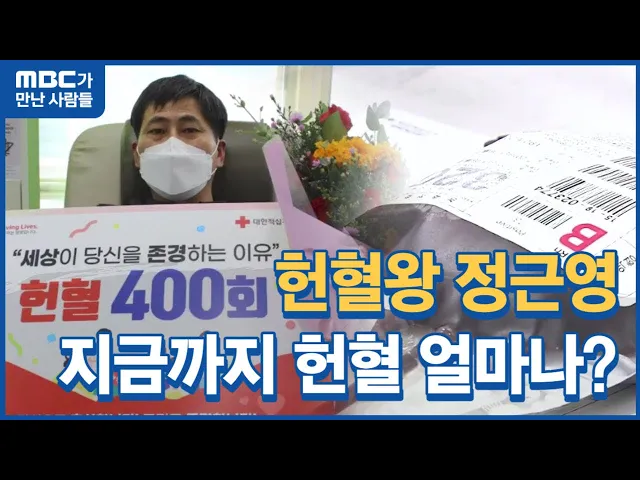 [앵커] 흔히 헌혈을 가르켜 가장 기본적인 사랑과 봉사의 실천이라고 하지만, 막상 실천하기는 어렵죠. 지금까지 40여년 간 400회가 넘는 헌혈을 하며, 이웃을 위한 사랑을 실천하는 분이 계십니다. MBC가 만난 사람 오늘은 정근영 헌혈왕을 모시고 이야기 나눠 보겠습니다. 안녕하십니까. Q. 지금까지 헌혈을 몇회나 하셨...