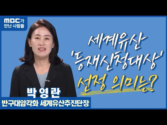 [앵커] 반구대 암각화와 천전리 암각화를 아우르는 '반구천의 암각화'가 유네스코 세계유산 '등재 신청 대상'으로 선정됨으로서 사실상 국내절차가 마무리됐습니다. MBC가 만난 사람 오늘은, 그 의미와 남은 과제 등을 자세히 알아보기위해 박영란 울산시 반구대암각화세계유산추진단장 모셨습니다.Q. '반구천의 암각화'가 ...