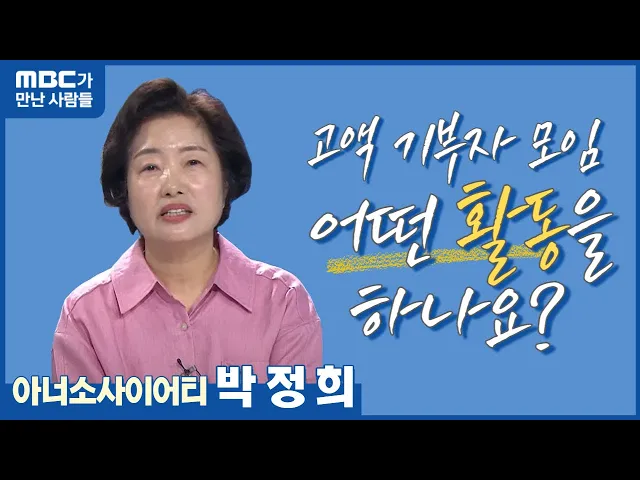 [앵커] 경제가 어려워질수록 우리 사회에는 도움의 손길이 필요한 사람들이 많아지고, 그런만큼 나눔과 기부의 필요성이 더욱 커지게 마련인데요. MBC가 만난 사람 오늘은, 울산의 기부문화를 이끄는 나눔 리더들의 모임이죠, 울산 아너소사이어티클럽 박정희 신임 회장 나오셨습니다.Q. 지난 달에 회장으로 취임하셨지만 ...