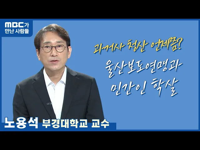 [앵커]6.25 전쟁이 발발한 지 74년이 지났지만 아직도 과거사가 청산 되지 않고 있습니다. 울산보도연맹사건으로 희생된 사람만 수 백 명에 달합니다. MBC가 만난 사람, 오늘은 한국 전쟁 전후에 있었던 민간인 학살을 연구해온 부경대 노용석 교수님을 만나보겠습니다. [리포트]Q1. 교수님께서는 어떤 계기로 한국 전쟁 당...