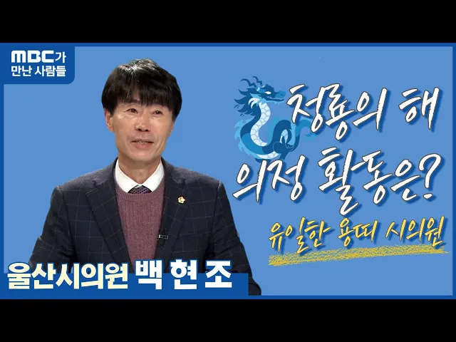 ◀ 앵 커 ▶ 갑진년 새해 울산시민의 대의기관인 울산시의회의 신년 계획 또 포부 들어보겠습니다. MBC가 만난 사람 오늘은 22명의 시의원 가운데 유일한 용띠 시의원입니다. 백현조 의원 모시고 이야기 나눠보겠습니다. 안녕하십니까 반갑습니다. 먼저 새해 복 많이 받으시고요. 새해 복 많이 받으십시오. 올해 좋은 일 가득...