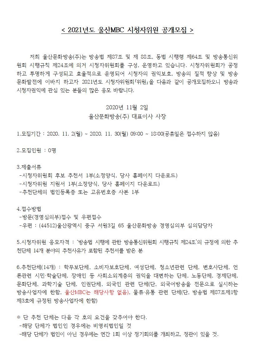 시청자의견 2021년도 울산MBC 시청자위원 공개모집 등록일 : 2020-11-02 09:34 조회수 : 1732 첨부파일 qtpl-YmxqE2G-울산MBC 시청자위원회위원지원서류.hwp (17.00 KB) 다운로드 여러분의 의견을 남겨주세요 ※ 댓글 작성시 상대방에 대한 배려와 책임을 담아 깨끗한 댓글 환경에 동참해 주세요. 0/2000 등록 수정 삭제 이전글 다음글 목록
